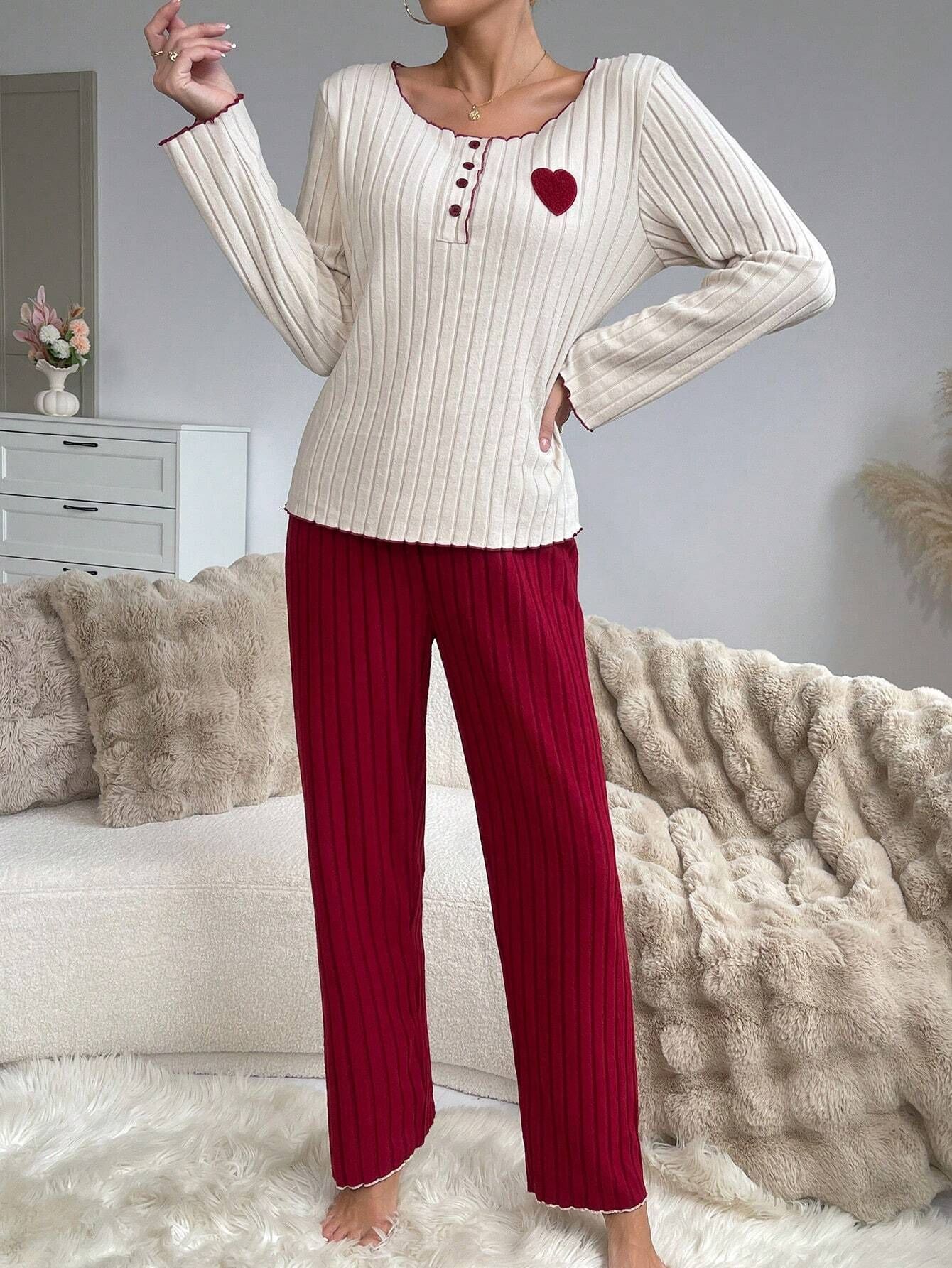 Fleece-lined Ribbed Heart Embroidery Long-sleeve Long Pants Wearable Homewear Set