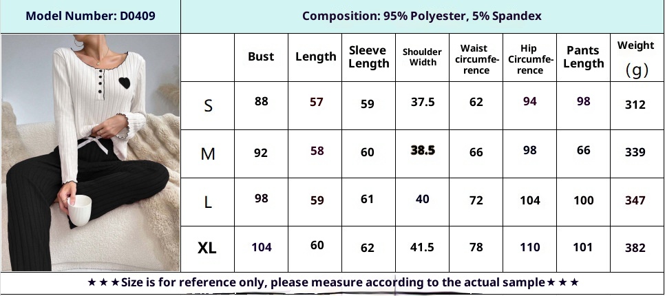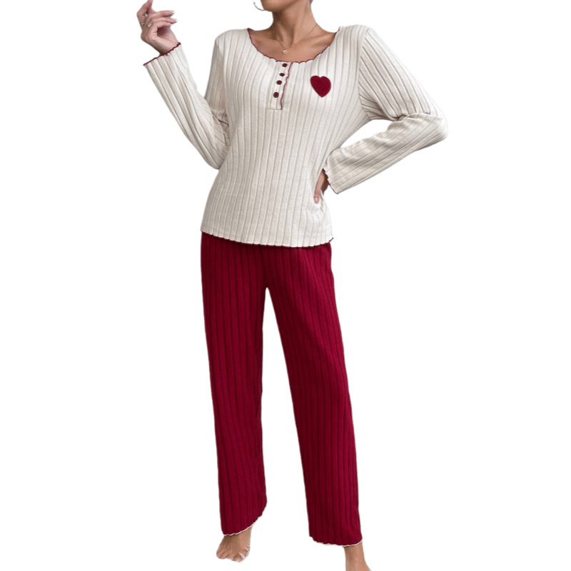 Fleece-lined Ribbed Heart Embroidery Long-sleeve Long Pants Wearable Homewear Set